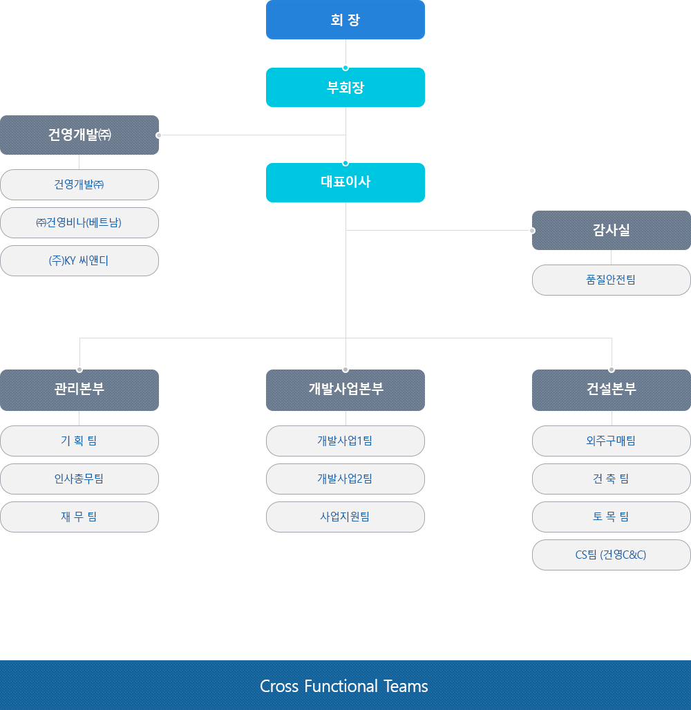 별도로 건영개발(주)가 운영되며 하위 회사로 (주)건영비나(베트남)과 (주)KY 씨앤디가 있습니다. 대표이사의 하위 부서로 감사실의 품질안전팀이 있고 관리본부에는 기획팀, 인사총무팀, 재무팀이 있습니다. 개발사업본부에는 개발사업1팀, 개발사업2팀, 사업지원팀이 있고, 건설본부에는 외주구매팀, 건축팀, 토목팀, CS팀(건영C&C)가 있습니다.